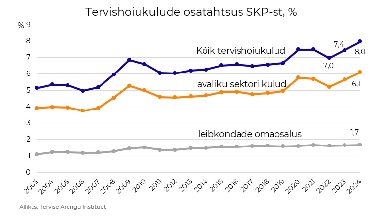 2023. aastal alanud tervishoiukulude osatähtsuse tõus sisemajanduse koguproduktist (SKP) jätkus ning ulatus 8%-ni, kuna tervishoiukulud kasvasid kiiremini kui SKP.