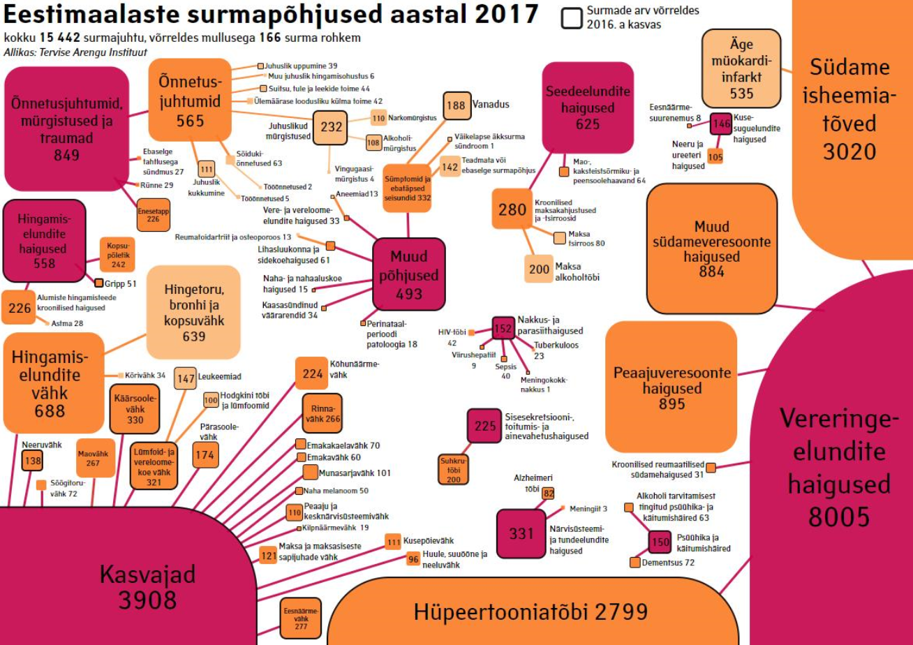 Üle poole kõikidest surmadest – 8005 – oli põhjustatud vereringeelundite haigustest, mis viisid meie seast 3199 meest ja 4806 naist. Surmapõhjustena järgnesid pahaloomulised kasvajad, millesse suri mullu 3816 inimest, ning õnnetusjuhtumid, traumad ja mürgistused, mille tõttu suri 849 inimest – 648 meest ja 201 naist. Kuigi õnnetuste, traumade ja mürgistuste tõttu surmade arv kahanes 21 võrra, kasvas enesetappude arv 186-lt 226-le ehk 21,5%.